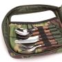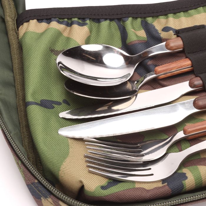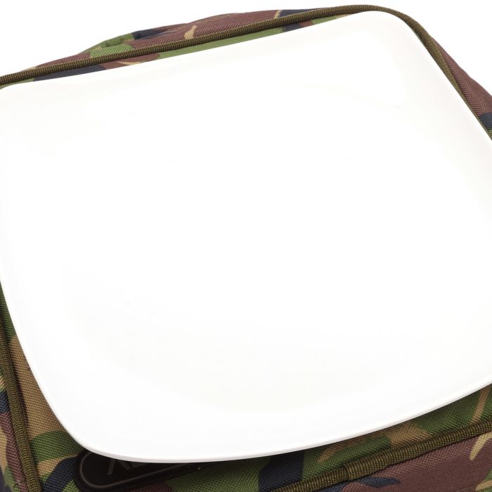 The Advanta 2-person dinner set is the ultimate item for angler who want to eat well on the bank and ensure they take all the necessary items with them for a few days or nights of fishing. The Advanta 2-person dinner set includes everything you would need to eat well and helps to reduce the chances of forgetting to take essential things such as plates, cups or cutlery when you leave the house, something we are sure many anglers have experience before. The Advanta 2-person dinner set includes 2 large square plates, 2 large plastic mugs, 2 sets of cutleries including knives forks and spoons. Also included are 2 small condiment pots for things such as salt and pepper or sauces and 2 hand towels to keep everything nice and clean. The Advata 2-person dinner set comes supplied in a hard-wearing camo case for convenience and features a carry handle for easy transport.