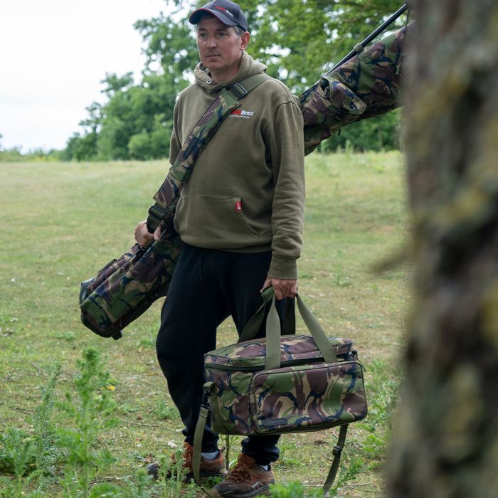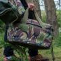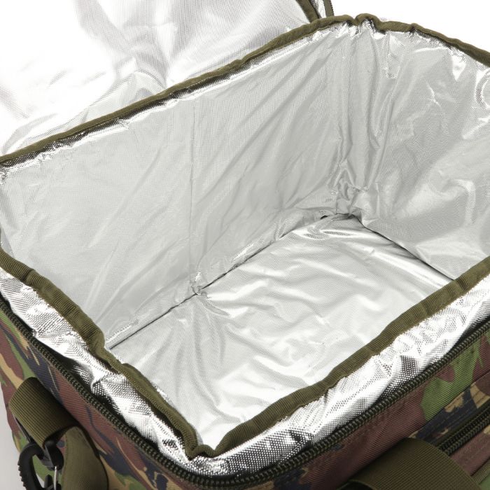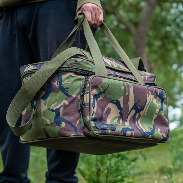 Advanta Cool Bag - Camo, The Advanta Cool bag has been designed to house all your food for the fishing trip and to keep things as cool as possible thanks for the thermal lined foil material that has been used to construct the bag. The Advanta cool bag is the prefect size for a few days and nights on the bank and due to its shape can hold a lot of items easily and securely. The Advanta cool bag is made using a terminally lined material that will help to keep your food fresher for longer and can be used in conjunction with freezer blocks to prolong the life of things such as meat and perishable good for much longer for anglers who stay on the bank for extended periods. The internal material used on the inside of the bag is fully wipe clean for ease if nay spillages happen and the outside of the bag features additional storage in the form of a small zipped pocket for items required for food or drink preparation. The Advanta cool bag also features carry handles for easy lifting and a padded and removable shoulder strap for times when you may with to carry the bag to and from your chins fishing spot.