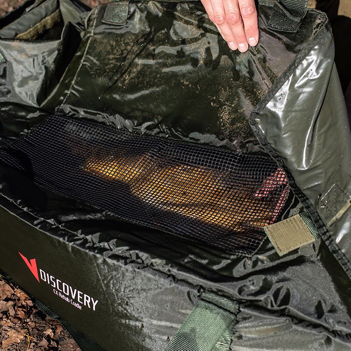 De Advanta Discovery CX Rehab Onthaakmat biedt een buitengewone bescherming als je een vis onthaakt of verplaatst. De mat bevat een semi stug gevoerd matras en ook de zijwanden zijn gevoerd. Dit zorgt ervoor dat de vis volledig ondersteund ondanks een ongelijke grond op je stek. De zachte handvaten zorgen voor extra comfort zodat je de vis altijd probleemloos kunt verplaatsen. Een mesh bodem zorgt ervoor dat water snel kan weglopen uit de mat. Je hoeft dus niet lang te wachten voordat de mat droog is! Een extra beschermende functie van de cradle is de Velcro bewaarflap. Deze flap kun je dicht slaan om de vis veilig in de mat te bewaren terwijl jij bijvoorbeeld je camera etcetera pakt.