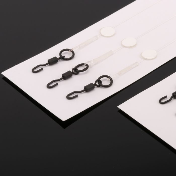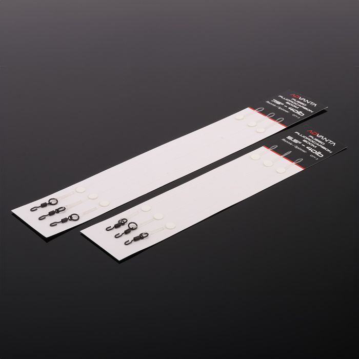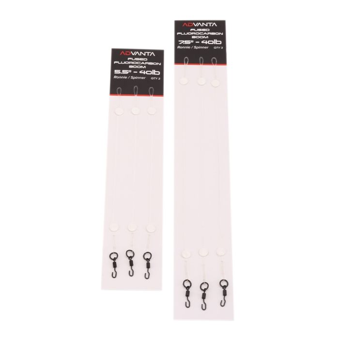 The Advanta Fluorocarbon fused booms feature an ultra-stiff fluorocarbon construction which is virtually invisible in water and will ensure you bait is pushed away from the lead on the cast, drop or if a fish ejects the rig without hooking itself. The Stiff Material will aid your rigs to reset after these events ensuring ultimate bait presentation. The Fused technology that bonds the rigs ensures exceptionally strong, neat, and tidy loops and rig presentation. The range features 2 length options and 3 swivel attachments to cover all rig presentations and substrate you are fishing over. The Pack contains 3 rigs per pack to ensure you can use the same style rig on each of your fishing rods.