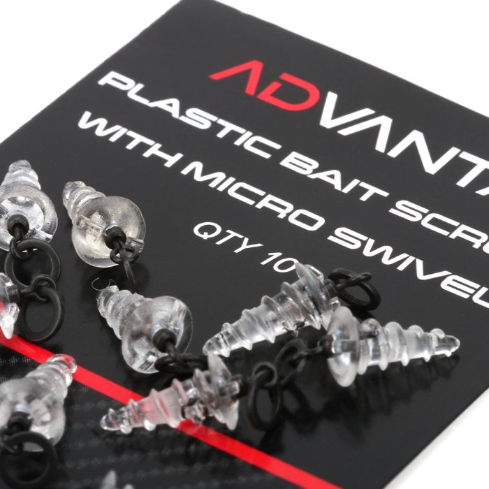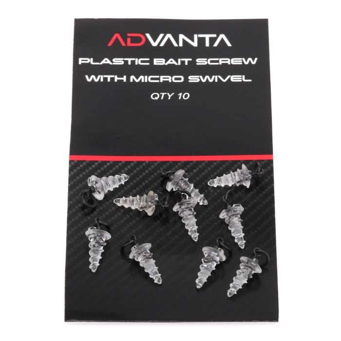 The Advanta plastic bait screws are designed to allow you to change baits quickly and easily in seconds thanks to the screw thread on the tip. This can be useful when fishing single hook baits and casting at showing fish or you just need to get the rigs out quickly. The Advanta plastic bait screws feature a round ring swivel that is moulded into the clear plastic screw, this allows for perfect movement along the hook bend or shank which offers maximum hooking potential as the fish are unable to eject the bait. The Advanta plastic bait screws feature an anti-glare matt finish swivel and are supplied in packs of 15 for anglers who want to makeup multiple rigs ahead of their next session. The Advanta terminal tackle range has been designed to offer maximum performance and quality to anglers who fish a variety of waters for specimen fish. The Advanta Terminal tackle range features all the essential items to construct multiple rigs easily and affordably. Each item has been manufactured from the highest quality materials to ensure quality when it counts.