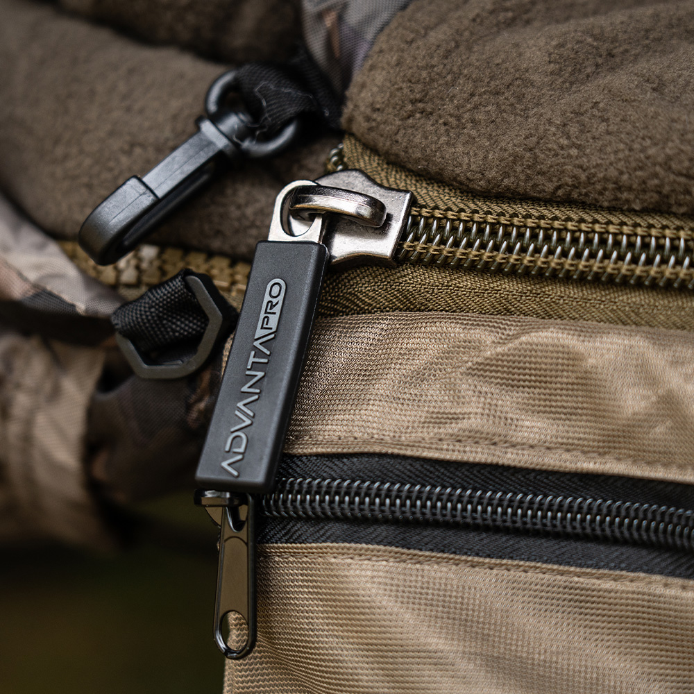 The Advanta Pro All Season Camo Sleeping Bag offers the ultimate in features, quality and versatility for anglers who want to fish year-round in all-weather types and conditions. A must have addition to your carp fishing tackle! The Advanta Pro all season fishing sleeping bag as the name suggests can be used all year round by adjusting the internal layers to suit their preference or time of year they are carp fishing. Being comfortable on the bank is vitally important to effort and angling success especially during the winter when nights are long and cold and keeping warm and is crucial to a good night’s rest. This Advanta all season sleeping bag features duel internal layers that can be removed completely for summer use or added back in when the nights draw in and the temperatures become cold. The internal layers on this fleece sleeping bag are also reversable meaning they can be turned over and refitted back into the bag allowing the angler to choose from either a warm fleece lining for colder nights or a smooth polyester that is cooler for spring or summer use. The filling inside this Advanta sleeping bag is silicone treated hollow fill material which can trap heat inside the bag and keep you warm and toasty all night long even in harsh winter conditions. The outer material is made using our exclusive Advanta Pro camo pattern and features both waterproof and breathable properties. The Design of the carp sleeping bag means it can be fitted to both the top and bottom of a standard size fishing bedchair using the elastic loops at either end of the bag as well and the retention strap in the middle of the bag to eliminate twisting during the night and on quick exit of the bag when a fish bites. Advanta have made sure that the zips on both sides are large, oversized crash zips meaning a quick exit is easy, they also finish a little way up from the foot end of the bag helping to maintain a hotspot down the bottom end to aid keeping your feet warm during cold nights. Each Advanta pro sleeping bag is supplied in an oversized stuff bag making it easy and convenient to pack away and store when not in use. Advanta Pro All Season Camo Sleeping Bag Tech Spec: Dimensions: Length W 100cm x L 220cm Packed dimensions: 44cm x 50cm Weight: 4.4kg