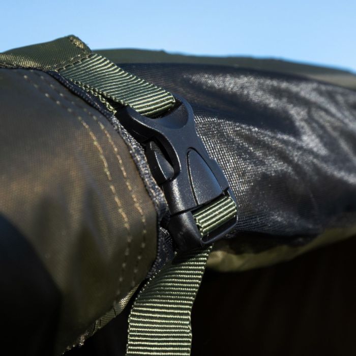 De overtrek kan worden vastgeklikt met de hengel klittenband bevestigingsriemen en de oprolbare voorpanelen worden teruggebonden met gespen. De overtrek heeft ook de keuze uit twee voordeurpanelen van ondoorzichtig groen of gaas. Het gaas maakt ventilatie mogelijk terwijl het ongedierte buiten de deur wordt gehouden. Met behulp van het heldere raam dat bij de bivak wordt geleverd, kunt u wat licht in de bivvy laten voor wanneer u tuigages in de schuilkelder bouwt.