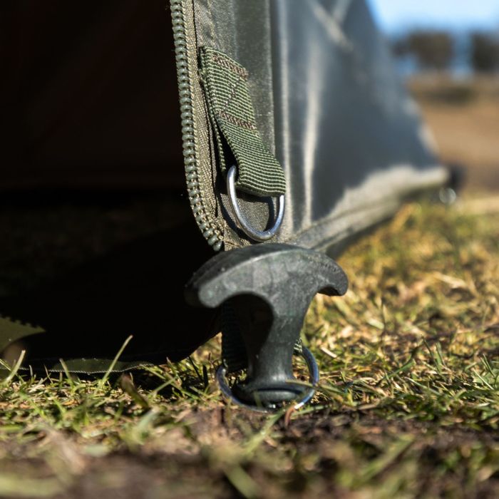 Door de verstevigde bevestigingspunten is er zelfs dan een hoge spanning van de koppeling, waardoor er geen plotselinge scheur ontstaat, waardoor de bivvy langer meegaat voor jaren van gebruik. De bevestiging aan de voorzijde heeft twee hoogte-instellingen, afhankelijk van de keuze, waardoor de bivvy dichter bij de grond komt te liggen. Advanta levert deze overtrek met heavy-duty T-haringen.