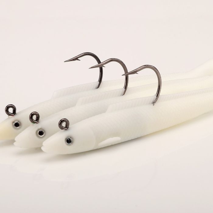 Advanta Super Sandeel Lure - Solid White, The Advanta Super Sandeel lure's are an amazing weighted Sandeel imitation with a lifelike action which is guaranteed to get the attention of all predatory fish. The body material is made of ultra-tough material that withstand multiple captures and fish with teeth nipping the tail. The Advanta Super Sandeel lures are all pre-rigged with an internal lead weight at the head end meaning they cast like a dream and are stable when retrieving them. The hooks used are the highest-grade Mustad saltwater hooks to ensure every fish is well hooked and the hook points remain super sharp even after multiple fish are caught. The 4 inch lures weight 11g and the 6 inch weight 25g meaning you the perfect weights for a wide variety of tactics and venues. The lures are ultra-versatile and can be used from the shore or boat.