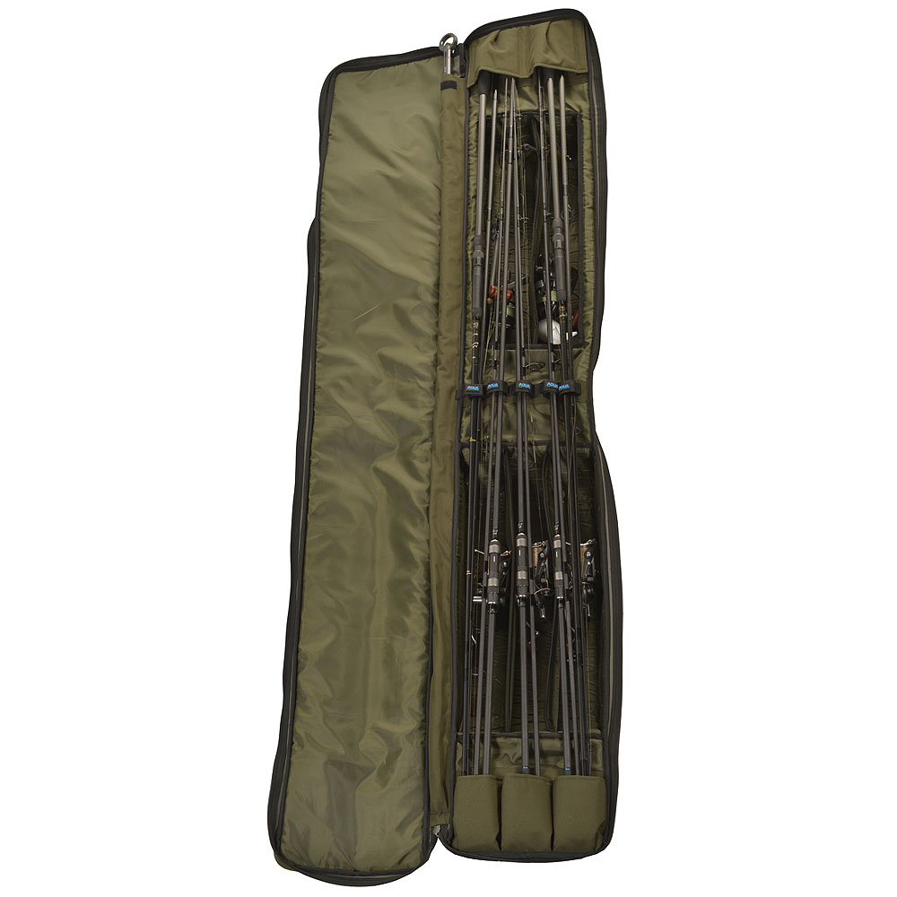 Met 10mm zware ritsen die zorgen voor een veilige opslag en tijdens transport deze foedraal, indien gewatteerd en gevoerd, met de capaciteit om maximaal vijf 12ft hengels te dragen en volledige bescherming voor 50mm eindt-ringen en big pit-molens. Om karpervissers zo volledig naar de oever te sturen. De verstelbare, gevoerde schouderriem maakt het mogelijk om een geladen foedraal langs de oever te dragen, waardoor het ideaal is voor struin vissers en degenen op het campagnepad zijn en vaak van visstek veranderen in een verlengde sessie.