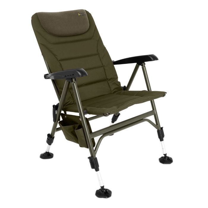 De stoel is ontworpen met comfort in gedachten. De **verstelbare armleuningen** zorgen ervoor dat je de stoel kunt aanpassen aan jouw voorkeuren, wat vooral belangrijk is als je lange uren aan het water doorbrengt.