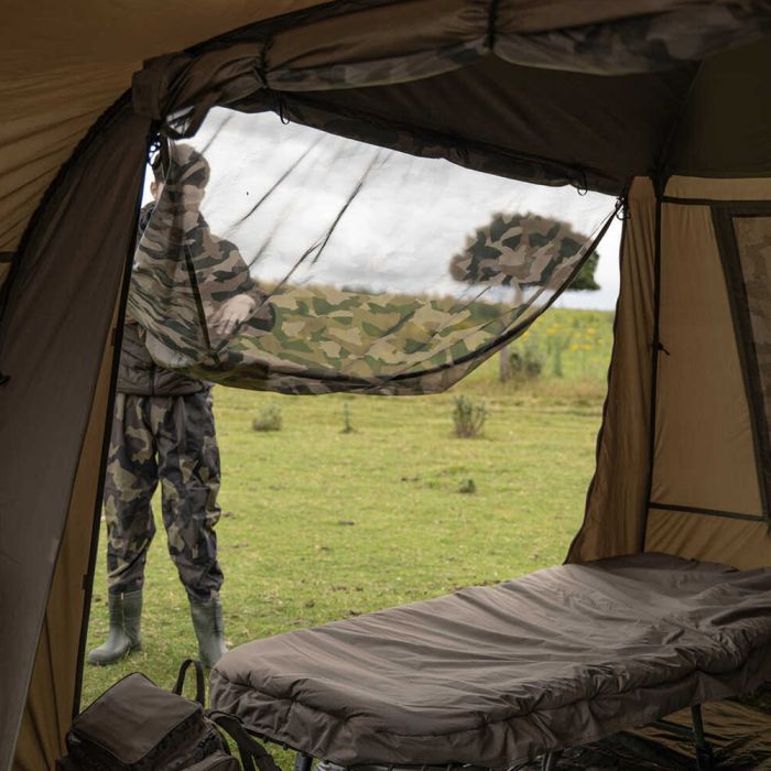 De bivvy is voorzien van verlengde zijpanelen voor extra bescherming tegen wind en regen. Dit zorgt ervoor dat de bivvy een afgesloten ruimte blijft, waar je droog en beschut kunt zitten. De grote ingang met rits maakt het gemakkelijk om in en uit de bivvy te stappen, zelfs met je handen vol uitrusting. Daarnaast zorgen de stevige mesh-panelen voor voldoende ventilatie en beschermen ze je tegen insecten, wat ideaal is tijdens warmere maanden.