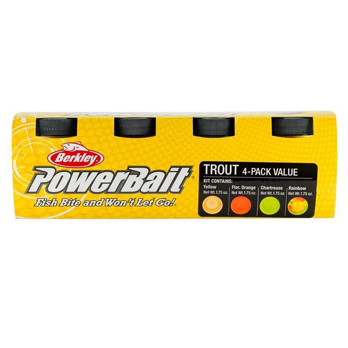 Berkley PowerBait® Forellenaas is kneedbaar en gemakkelijk te gebruiken. De drijvende formule verrijkt de verspreiding van de geur en smaak van PowerBait. Deze 4-pak bevat je favoriete en populaire kleuren: Chartreuse, Rainbow, Fluorescerend Oranje en Fluorescerend Geel.