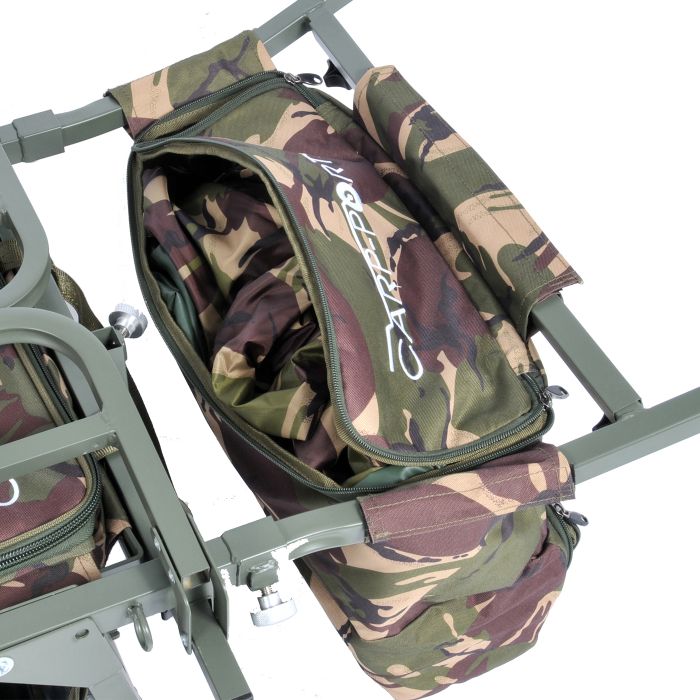 De DPM Deluxe Transportkar Hoes & Tas van Carp Porter zijn ontworpen om op alle kruistangen te passen en bieden een eenvoudige manier om uw uitrusting netjes, georganiseerd en beschermd te houden tegen plotse regenbuien. Met een afmeting van 270 cm x 170 cm kan deze transportkarhoes met camopatroon ook worden gebruikt als noodonderkomen, terwijl de waterdichte, afgeplakte naden ervoor zorgen dat alles wat u bedekt droog blijft. Een achterzak met rits op de transportkarhoes maakt het mogelijk om een reservejas binnen handbereik op te bergen, wat ideaal is wanneer u in de lente en de herfst aan het vissen bent, wanneer het weer bijzonder wisselvallig is.