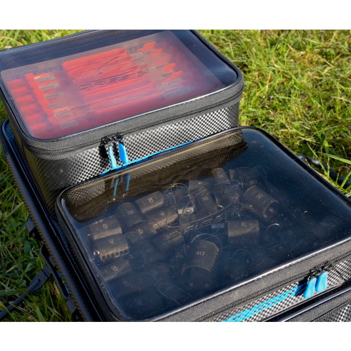 De waterdichte EVA Accessory Bag Large Low biedt ruimte aan tal van accessoires, zoals feeder, rigs, reels en andere tackle, waaronder het Cresta Modular hooklength systeem. Dankzij het doorzichtige deksel is de inhoud direct zichtbaar als het deksel dichtgeritst is.