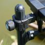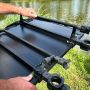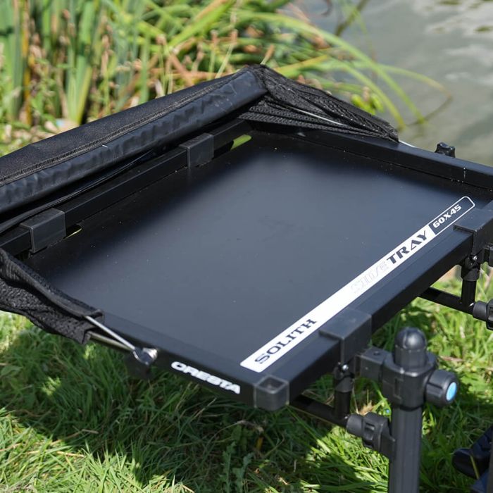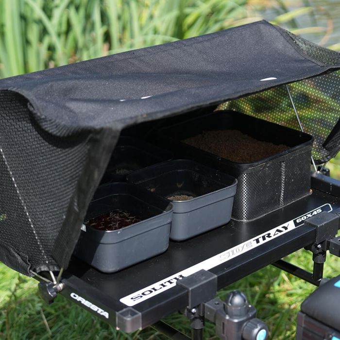 The Cresta Solith Hooded Side Tray is the ideal bait table in all conditions, with an adjustable hood to protect all your bait from sun and rain. At 60x45cm the internal dimensions will hold at least 6 large bait tubes with plenty of room left over. The mounting points have a double locking mechanism. The metal clip allows the block to be opened fully so that it can be wrapped around a leg from the side. A compact rotary knob with a non-marking clamping system ensures the block is fixed at the desired height. With the inserts provided, the opening of 36mm can be reduced to 30mm. The position of the attachment points can be adjusted to suit the distance between the legs of the seatbox. The two folding support arms make it completely self-supporting.