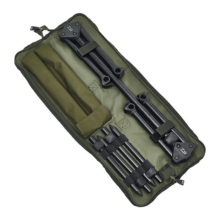 The lightweight, classic low-level Black Widow Rod Pod can be set up quickly and easily and is very stable on the ground. With 4 adjustable banksticks and buzzer bars with brass thread for 3 bite indicators. Supplied with transport bag.