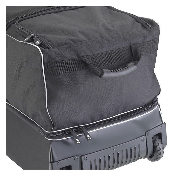 The extra big reels and the robust extendible handle, care for an easy transportation of the bag even over uneven ground. Two lateral straps can be fixed to the bag and ensure a safe storage and protection of the zipper even under heavy load. The extra big zippers are made of ABS material and don't corrode – additionally both main compartments can be locked.