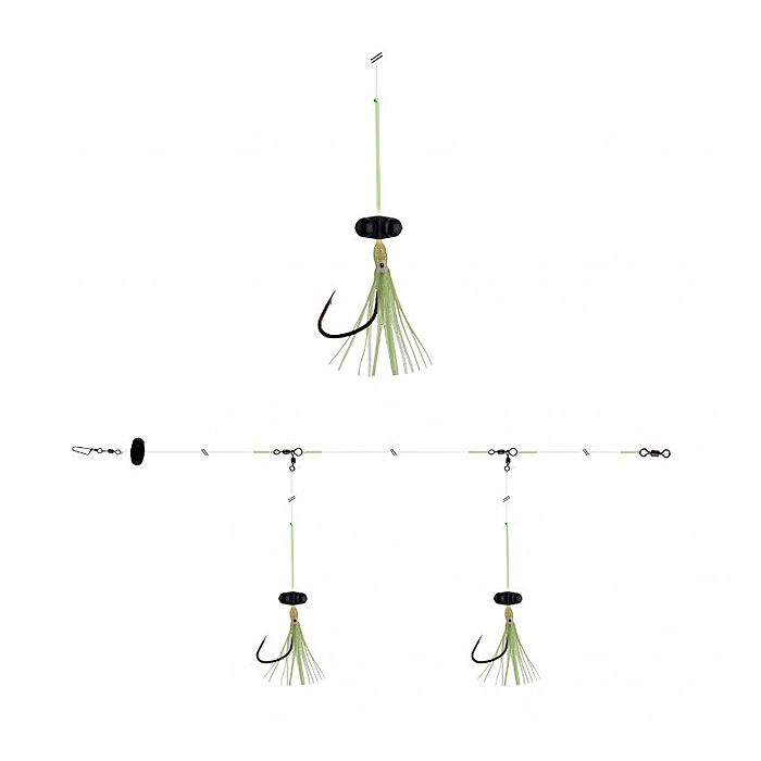 The GrandWave Rattlin rig has especially been developed for catching wolffish. The rattles produce additional attractions, which tempt the wolffish to attacks. The rig should be presented vividly at the ground to produce loud noise. The special rotation swivels at both sides and the knot protection as well as the tubes at the octopus prevent tangling of the rig during sinking in great depths and at strong currents. Perfect for middle and northern Norway! The big, strong hooks are perfect for baitfish and other natural baits. Delivered with winder for an optimal storage of the rig after usage.