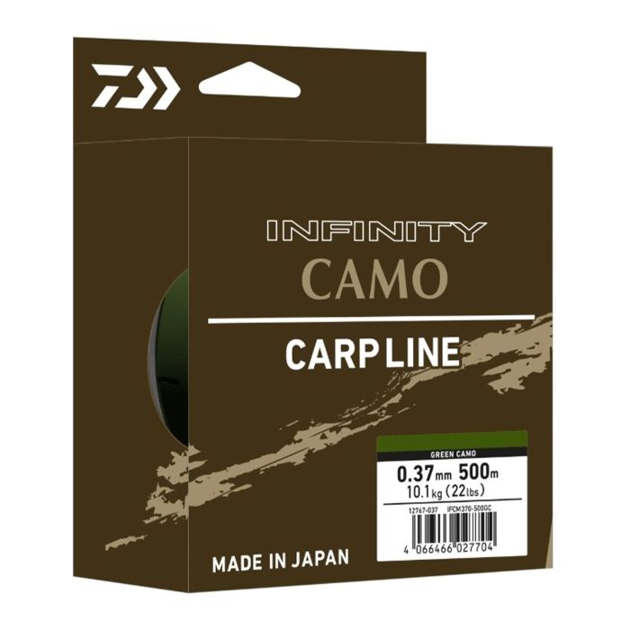 With this novel sinking Infinity carp line DAIWA offers a real innovation – thanks to its density of 1.2 this line is considerably heavier than water (approx. 0.99) and thus perfectly drops down right to the bottom. The colour unsteadily changes throughout the whole length and inconspicuously adopts to the bottom. The dull surface does not produce any reflections – perfect at heavily frequented waters and cautious fishes. The new Material has been developed over a long period in our headquarter in Tokyo and is really unique regarding its features. Compared to sinking, stiff fluorocarbon material the new Infinity Sinking is supple and soft and offers a favorable stress-strain-behavior – perfect, to prevent losses during the fight and archive a good knot strength under load. Available in two camo colours.