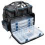 Deze tas heeft een hoofdcompartiment dat groot genoeg is om vier visgereiboxen in op te bergen. Voor het gemak zijn deze dozen ook toegankelijk vanaf de voorkant van de tas via een ritsronde klep. Dit betekent dat als u de uitrusting boven op de potten opbergt, u er toch bij kunt zonder dat u alles hoeft uit te pakken.