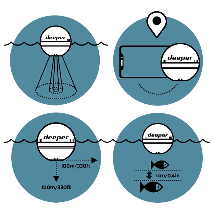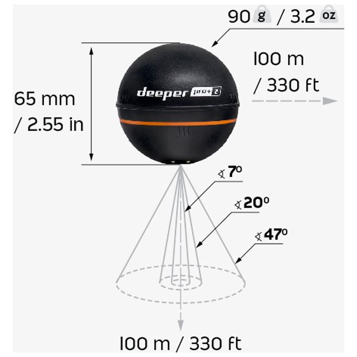 Ingebouwde GPS Maak meerkaarten vanaf de boot of kajak en zelfs vanaf de oever, steiger of oever. Werp de hengel uit en begin met het in kaart brengen van een waterlichaam. Uw kaarten worden automatisch opgeslagen in Fish Deeper en zijn toegankelijk op elk apparaat. Uitstekend diepte- en werpbereik Scant tot op 100 m nauwkeurig en precies. Het genereert zijn eigen Wi-Fi-signaal (geen mobiele gegevens nodig) om verbinding te maken met uw smartapparaat, dus werp tot op 100 m en u kunt erop vertrouwen dat er een rotsvaste verbinding is.