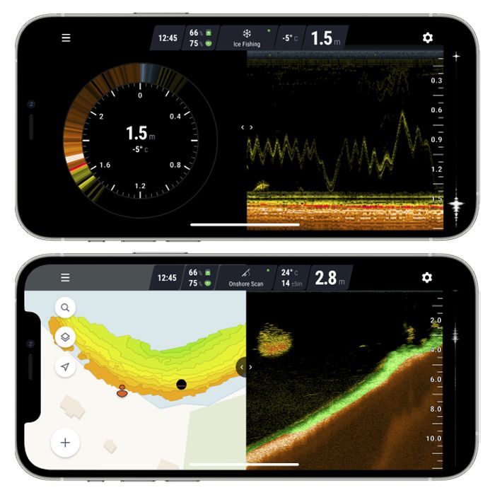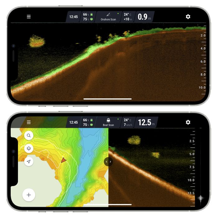 Uitstekende doelscheiding Met een doelscheiding van 1 cm (smalle bundel) en 2,4 cm (brede en middelste bundel), kunt u gemakkelijk doelsoorten lokaliseren en zelfs het kleinste kunstaas volgen tijdens het vertical jiggen. Slim vissen met de Fish Deeper-app Gedetailleerde en scherpe beelden. Onderscheid roofvis van aasvis, bodemknuffelaars van bodemcontouren. Zie vegetatie, structuur, vis en bodemcontour, evenals de hardheid en consistentie van de bodem. Ken de waterdiepte en -temperatuur.