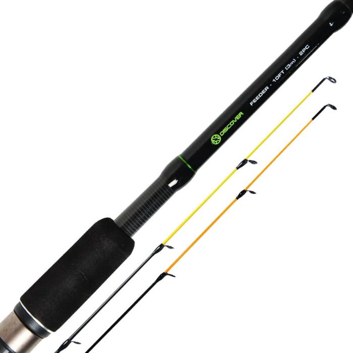 Discover Feeder rods offer the kind of versatile performance expected from much higher priced products, also providing quality carbon blanks, line guides, cork/EVA handles and state of the art reel seats. These compact two-piece rods are perfect for ready tackled storage, so you get to maximise your fishing time when out on the bank. All the feeder rods in the range are supplied with 1oz and 2oz quivertips, covering bomb, groundbait, maggot, pellet and method feeder tactics. 11ft / 3.3m Features a two-piece format for easy, ready tackled storage in a holdall or rod sleeve. The lighter 1oz quivertip is perfect for spotting shy bites from silver fish, while the heavier 2oz indicator suits method or pellet feeder applications. This versatile feeder rod is perfect for commercial fishery usage, but also covers river, drain or wild lake tactics with conventional swimfeeders. Carrying a line rating of 3 to 8lb and capable of launching loadings up to 60g, theres plenty of casting power, but this is nicely tempered with a forgiving tip section. 10ft / 3.0m This lightweight rod has a good amount of reserve power in its butt section, combined with a softer tip action, covering everything from silver fish to bagging carp on the commercials. Its two equal length sections (with a quivertip installed) pack away neatly, so the rod can be ready tackled prior to fishing. The 1oz quivertip is sensitive enough to show up delicate bites with groundbait or maggot feeders, while the 2oz bite indicator suits method and river feeder fishing. Recommended for use with 3 to 8lb lines and for casting loadings up to 50g, this is a compact yet versatile feeder rod. 9ft / 2.7m Two equal length sections with a quivertip installed allow this 10ft feeder rod to be stored away ready tackled, which saves valuable fishing time when out on the bank. The lighter 1oz quivertip suits silver fish applications with groundbait or maggot feeders, while the 2oz indicator is tailor made for method feeder fishing. This is an ideal feeder rod for short to medium casts on commercial fisheries, smaller rivers, drains and lakes. It has a superb progressive action that can deal with surprisingly big fish with its 3 to 6lb line rating, plus theres enough power to cast feeders up to 40g.