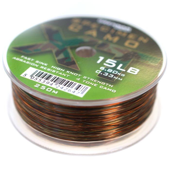 Specimen Camo XT is een uitzonderlijk snel zinkend, taai, duurzaam en zeer slijtvast bestand waardoor het ideaal is voor verschillende hengel situaties. Specimen Camo XT wordt geleverd op zowel 100m als 250m spoelen, waardoor het kan worden gebruikt voor haaklengtes of als een hoofdlijn. Deze lijn is voorzien van een unieke vierkleurencamo die helpt de lijn over een breed scala aan substraten te breken, of dat nu op een rivier of in een stilstaand water is. Verkrijgbaar in zeven maten van 4lb tot 15lb.