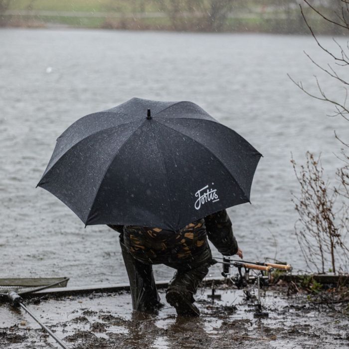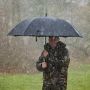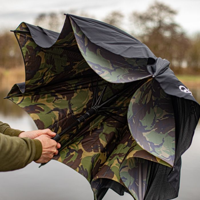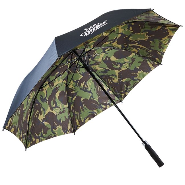 Een dubbellaagse paraplu, zwart aan de buitenkant, DPM aan de binnenkant. Robuust frame dat bestand is tegen extreme weersomstandigheden. Glasvezelstang en ergonomisch, antislip handvat. Ontworpen voor de mobiele visser, die maximale bescherming biedt bij de eerste jacht door guur weer.