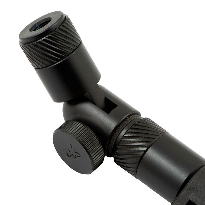 De nieuwe hoekadapter is voorzien van het QR-systeem om een alarm- of achter steunen op de bovenste helft en een schroefdraad in de onderste helft te kunnen gebruiken met beide soorten oeverstokken. Perfect voor het naar beneden hangen van uw alarmen bij het vissen van uw hengeltips hoog.