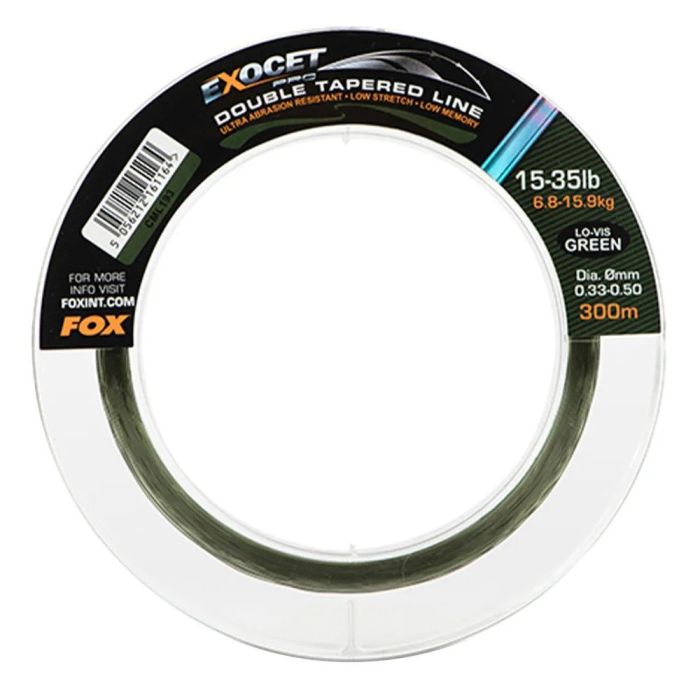 Fox Exocet Pro Double Tapered Fishing Mainline, The Fox Exocet Pro Double Tapered Fishing Mainline is perfect for anglers looking to get the most out of their casts. The line tapers from a 0.50mm diameter down to a thinner diameter, allowing for increased distance casting and improved accuracy. The low vis green coloration helps keep the line hidden from fish, while the double tapered design ensures that there is minimal stretch for a more sensitive connection to your lure or bait.
