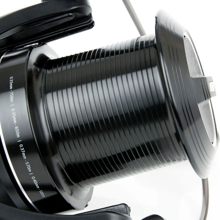 Enorme lijncapaciteit. Ideaal voor afstands werpen en afstand bootwerk. Bewerkte massief aluminium handgreep. Roestvrij stalen as. 90 cm van de lijn teruggehaald per draai aan het handvat. Superslanke oscillatie voor onberispelijke lijnlegging. Koolstofversterkte polymeerbehuizing en rotor. Snelkoppeling met korrelbescherming. Slijtvaste grafiet behuizing. Minimalistische matzwarte styling en discrete zilveren sierlijsten. Rotorrem en anti-slip systeem. Micro-lijn lig regeling. Rotor lijnbeschermer. 2 Serie Werp Lijn Clips een zwarte, een zilveren. Rotor gebalanceerd profiel. Draaivrije rol. Progietlip op spoel. 5 roestvrijstalen kogellagers + 1 rollager.