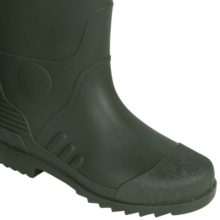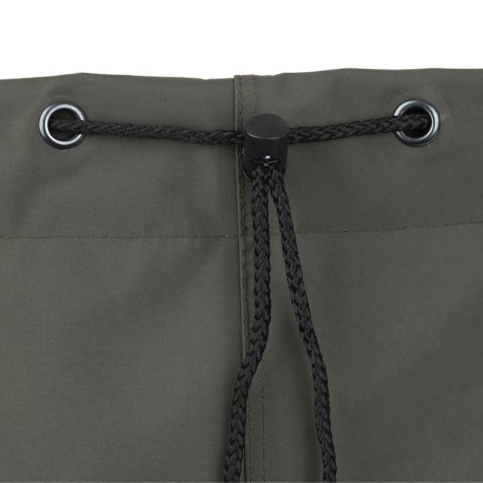Duurzame nylon Taslon-stof. Volledig getapete naden. Heavy-duty PVC-laarzen. Geweven zolen. Verstelbare, elastische bretels. Snelsluitingen. Trekkoord op de borst. Grote binnenzak op de borst. 60% polyvinylchloride, 40% nylon taslon