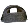 Een andere fantastische eigenschap van de tent zijn de drie wisselpunten op de deur. Deze zijn enorm handig en stellen je in staat om de deur op die manieren vast te maken. Door je deur net naar buiten vast te zetten geef je jezelf net dat beetje extra ruimte. Dit is ideaal als je gaat koken in je schuilplaats en je wat extra ruimte nodig hebt. De deur van de tent bevat twee ritsen. Hierdoor kun je de deur op de zogenaamde 'letterbox style' openen en genieten van het uitzicht op je hengels. Dankzij de luifel kun je zelfs in regenachtige omstandigheden naar buiten kijken, zonder dat het naar binnen regent. De deur aan de voorkant kan ook vervangen worden met een compleet muggengaas, die ook twee ritsen bevat. Dit is ideaal bij warme omstandigheden waarbij je wil genieten van frisse lucht zonder last te hebben van muggen. De achterkant van de bivvy bevat ook een groot raam met muggengaas, om de doorstroming van de lucht verder te bevorderen.