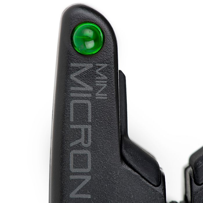 Met een drop back differentieel, 2 x 5 mm High Vis groene LED's gepositioneerd aan de bovenkant van de oren, evenals LED intensiteit instelbaarheid, heeft dit alarm ook visuals gedekt. De Mini Microns heeft ook rubberen inlays om je hengel te beschermen, een aan/uit schakelaar voor als je snel je alarm wilt uitzetten en een gekartelde vergrendelkraag voor stabiliteit.