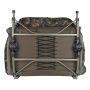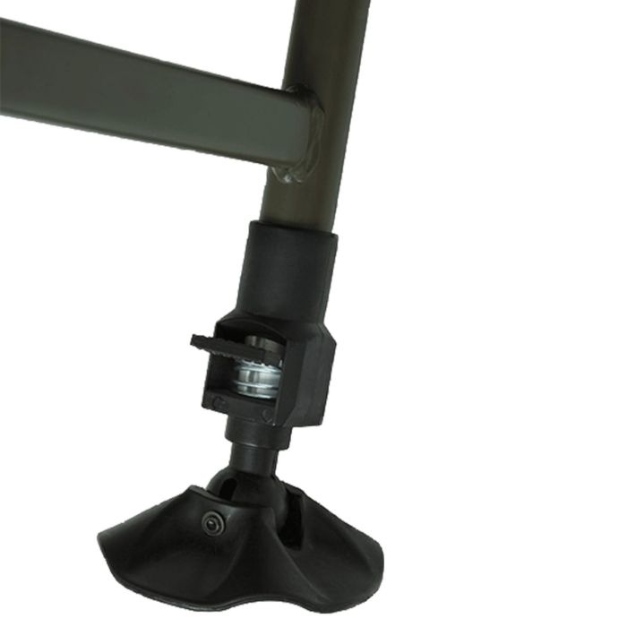 De structuur van de stretcher wordt beveiligd door de dubbele scharnieren en unieke zijspanningsriemen die ook een compact opgevouwen slaapsysteem mogelijk maken. De grote draaibare modderpoten met zes verstelbare poten die passen bij het niveau en het terrein waarop je je bivvy hebt ingesteld, zodat je je niet onstabiel voelt vanaf het bed dat wiebelt wanneer je in slaap valt.