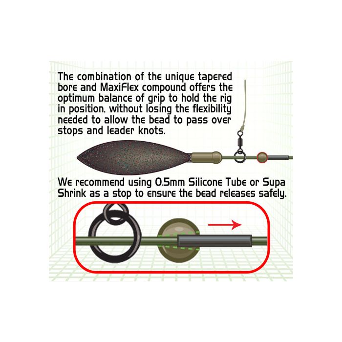 MaxiFlex-rubbersamenstelling met conische binnenboring is speciaal ontworpen om over stops en aanloopnaden te trekken die essentieel zijn voor het veilige gebruik van leadcore.