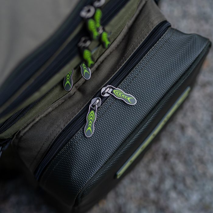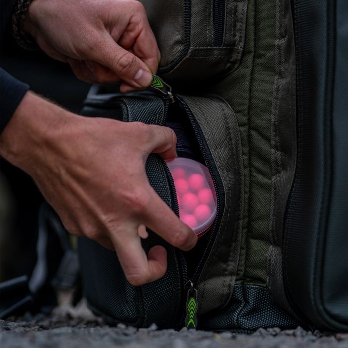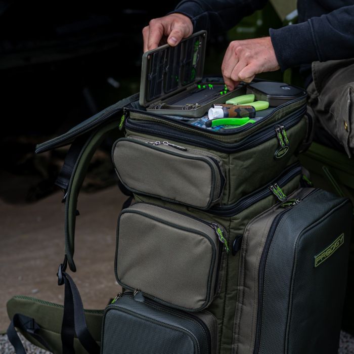 Het grote hoofdvak is ideaal voor kleding en kookartikelen, zodat je altijd snel en eenvoudig een maaltijd of een kop thee kunt maken of gemakkelijk kunt wisselen naar bijvoorbeeld een cool t-shirt of regenkleding, als de situatie daarom vraagt. Het grote vak op de voorkant van de tas is ontworpen om te gebruiken met de Prodigy Klip-Lok Visgerei Basis Box, maar ook gelijkwaardige visgereiboxen passen in dit vak. Een geisoleerd aasvak zorgt ervoor dat alle ingrediënten in je aas zo vers mogelijk en in topconditie blijven, klaar om de onderwater wereld te verrassen met wat lekkers.