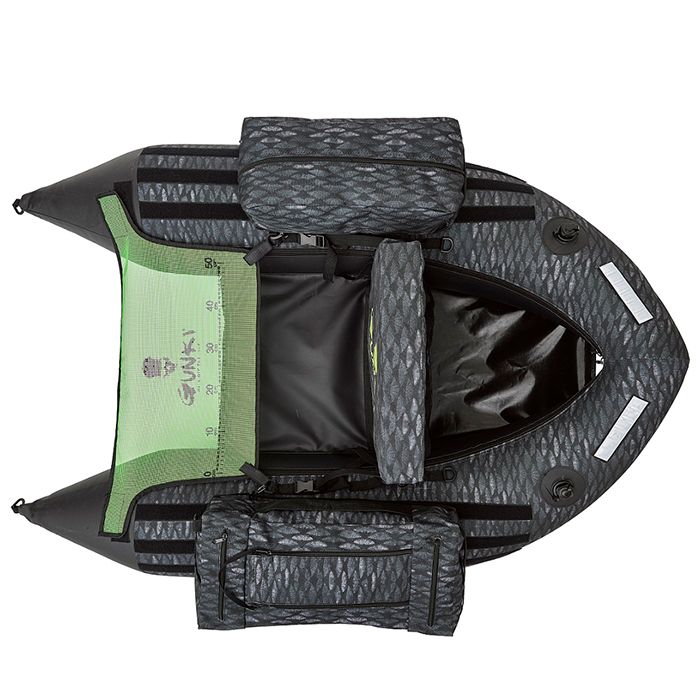 Met zijn gestroomlijnde V-vorm, het comfortabele zitvlak en het uitstekende drijfvermogen maakt deze vlotterbuis het verplaatsen op het water gemakkelijk! Uitzonderlijk stabiel kom je snel op de beste visplekken. Hij is ongelooflijk wendbaar en toch discreet in het water. Afgewerkt in een camouflage-viskleur voor extra discretie. Afneembare reflecterende veiligheidsbanden met klittenband. Bestaat uit: Gunki medium zak (x1), Gunki Team zak (x1), reparatieset, transportbanden, voetpomp, hengelkras (x2), draagtas, reflecterende veiligheidsbanden (3)