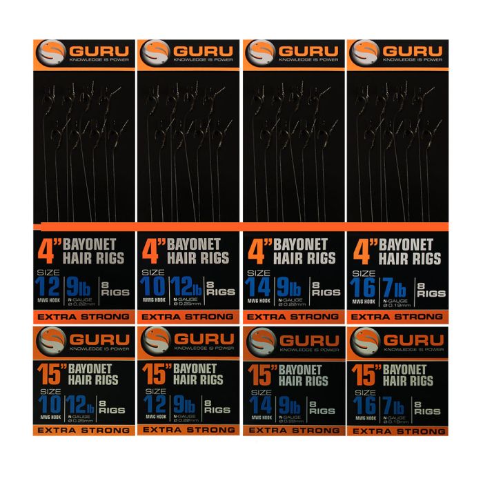 Deze kant-en-klare tuigages zijn voorzien van onze kleine Aas Bayonetten die aan de hair is vastgebonden. De bajonetten zijn gedraaide metalen pinnetjes die het mogelijk maken om zelfs vrij hard aas, zoals boilies en kunstmatig aas, zeer snel te bevestigen. Ze zorgen voor een veilige bevestiging, waardoor lange, krachtige worpen kunnen worden gemaakt, veilig in de wetenschap dat het aas zal blijven zitten.