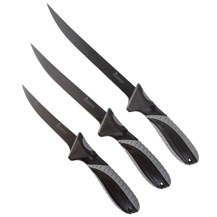 De Imax-messen zijn geselecteerd om ervoor te zorgen dat u het optimale uit uw visreis haalt. Weer moet je je vangst fileren of aas klaarmaken voor je rigs. Imax heeft gebruik gemaakt van sterk Japans 440, zwart gecoat, cryogeen behandeld roestvrij staal. De messen zijn voorzien van antisliphandgrepen van 12,5 cm die comfort en meer controle bieden. Elk mes wordt geleverd met een keramische slijper. Houd de messen buiten het bereik van kinderen.