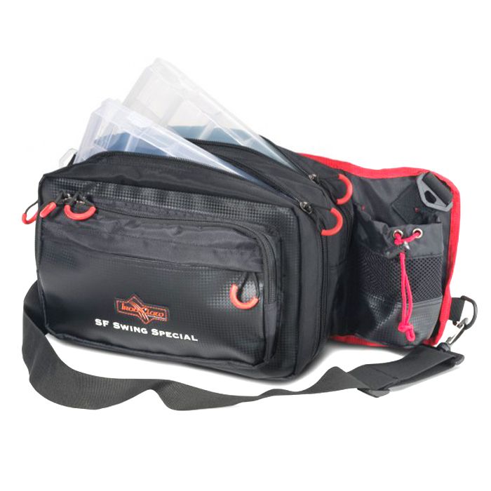 De Iron Claw SF Swing is de perfecte tas voor lange visreizen. Het sluit nauw aan op je lichaam en biedt twee hoofdvakken voor aasdozen en twee opbergvakken voor accessoires. De ritsen zijn voorzien van extra stevige lussen, zodat je ze ook met handschoenen of natte handen gemakkelijk kunt openen en sluiten.