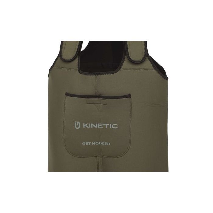 Choose Kinetic NeoGaiter neoprene chest waders when the weather turns cool. The 4mm neoprene construction provides ideal flexibility and mobility. All seams are taped, glued and stitched to protect against leaks and deliver long-lasting performance. Nice and soft nylon boots with cleated soles. Adjustable neoprene shoulder straps help provide a comfortable, customized fit. Also features chest pocket.