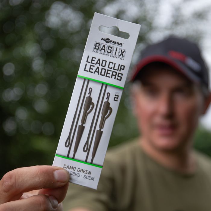 De Korda Basix Lood Clip Leaders zijn gemaakt van gewoven, loodvrij material dat goed water opneemt en daardoor snel zinkt plus soepel de contouren van de bodem volgt. Dankzij de camo groene kleur zal de leader mooi wegvallen op de bodem.