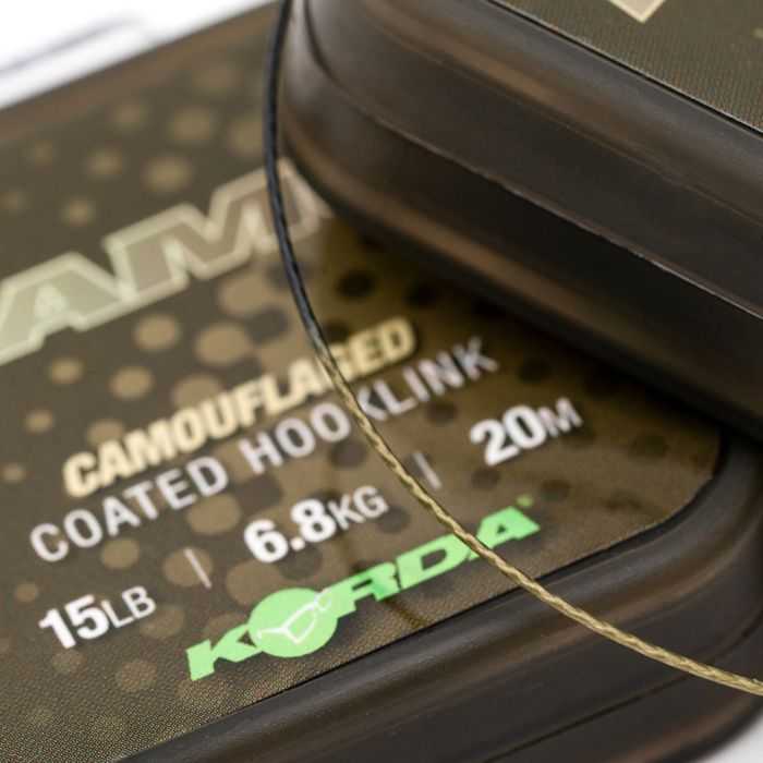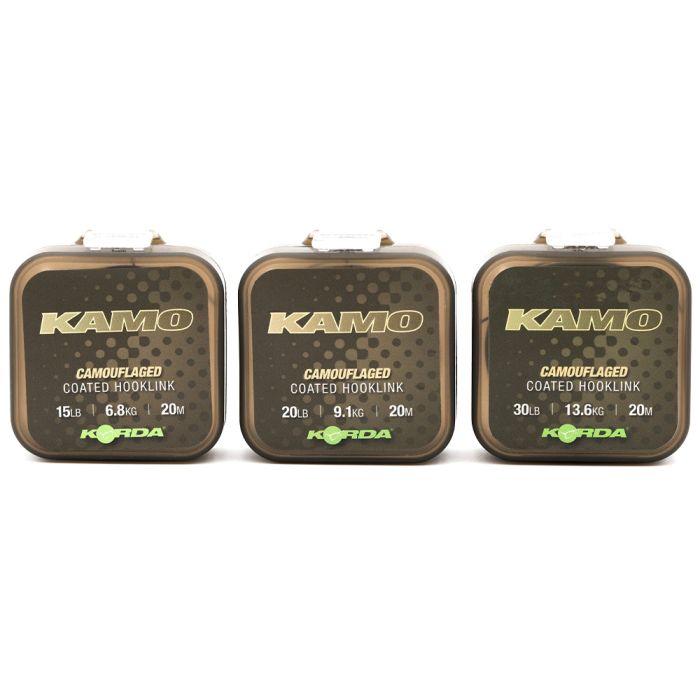 Vaak weet je niet op wat voor een type bodem je terecht gaat komen en kan het moeilijk zijn een keuze te maken uit de verschillende type en kleuren onderlijnmateriaal. Door bij de Korda Kamo een gecoat onderlijnmateriaal te voorzien van een gecamoufleerd patroon dat elke paar centimeters van kleur veranderd valt het goed weg op elk type bodem. De coating zit op het gebied van stijfheid tussen N-Trap Soft en de Semi Stiff in heb je daarmee een perfect allround materiaal voor haast elke situatie.