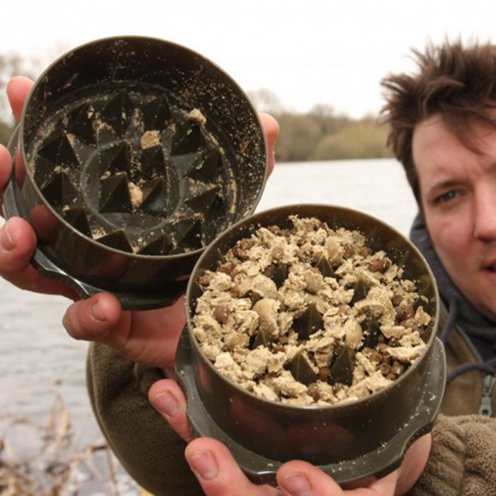 Dus, een paar jaar geleden, brachten de slimme leveranciers van 'denkend materiaal' bij Korda de Korda Krusha uit. Het is een verblindend eenvoudige oplossing voor de rommel en moeite die het verpletteren van aas voor mixen met zich meebrengt. In staat om kruimels te maken van zowel boilies, pellets en noten, is de Krusha een ultra-sterk en veerkrachtig maalapparaat dat bestaat uit slechts twee delen. Open het en plaats je aas in het onderste deel, doe de bovenkant er weer op en draai. Wanneer je hem weer opent, hebben de in elkaar grijpende sets van scherpe interne tanden de inhoud tot een kruimeltje vermalen. Hoe fijn je het wilt hebben hangt af van hoeveel je vermaalt. Zo simpel is het! Doe al je gemalen aas in een bak, meng er de gewenste toevoegingen door en je bent klaar om op te tuigen.