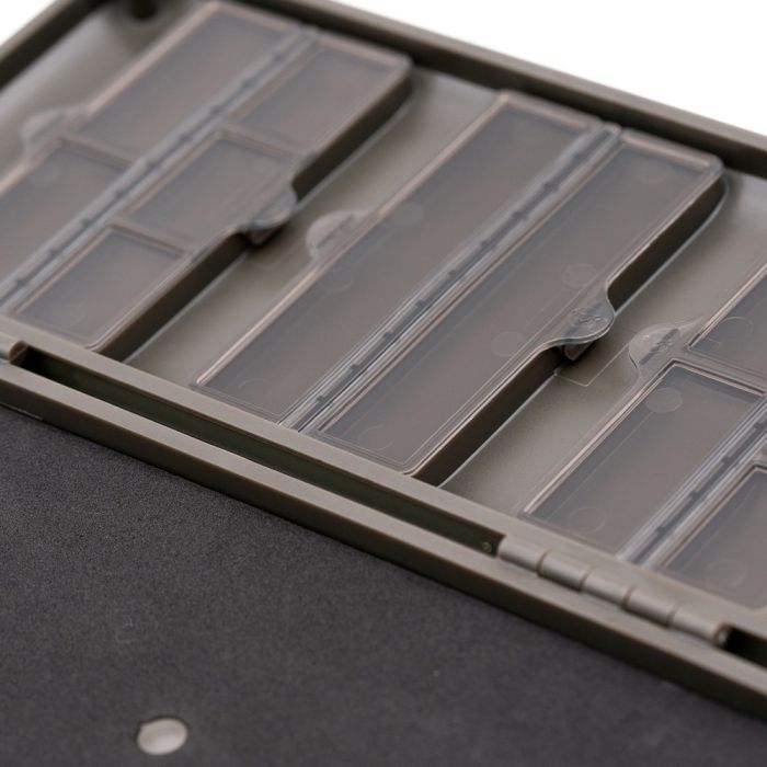 Maar wat maakt de Combi Tuig Tas nu anders dan de even grote Mini Tuig Tas? Het verschil zit hem in de bovenkant van de safe. Daar waar je bij de Mini uitvoering aan beide kanten ruimte hebt voor onderlijnen zijn er in de Combi RigSafe zes verschillende compartimenten aangebracht. Deze afsluitbare vakken zijn in verschillende maten en bieden opbergplekken voor bijvoorbeeld shrink tube, rig ringetjes, wartels en allerhande andere zaken. Op deze manier heb je dus een groot deel van je klein visgerei in een handig en klein opbergsysteem.