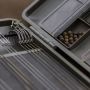 Bij de afdeling Product Development van Korda kwam er echter de vraag of het niet mogelijk is om een opbergsysteem voor onderlijnen te maken waar je tegelijk diverse Tuig essentials zoals kickers, anti klit mouwen, wartels en andere kleine spulletjes kwijt kan. Na met deze vraag aan de slag te zijn geweest zal vanaf eind april de Combi Tuig Tasje op de markt verschijnen. In deze compacte rigbox heb je aan een zijde de mogelijkheid om onderlijnen tot twintig centimeter in lengte op te bergen door eenvoudig gebruik te maken van de bijgeleverde pins.