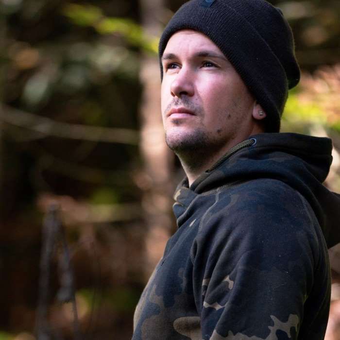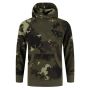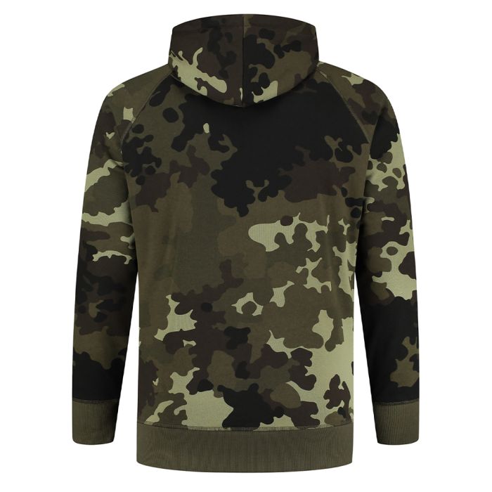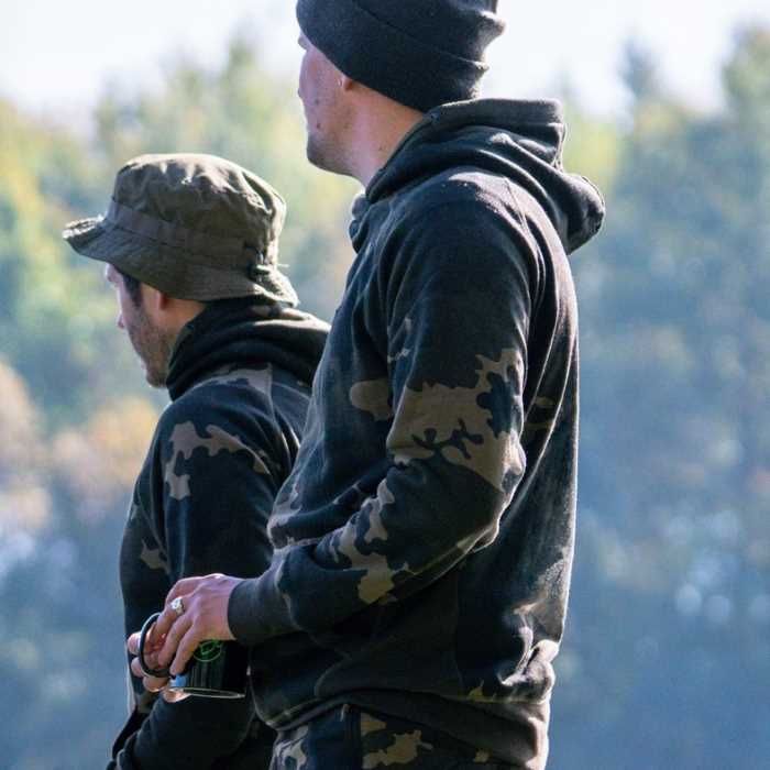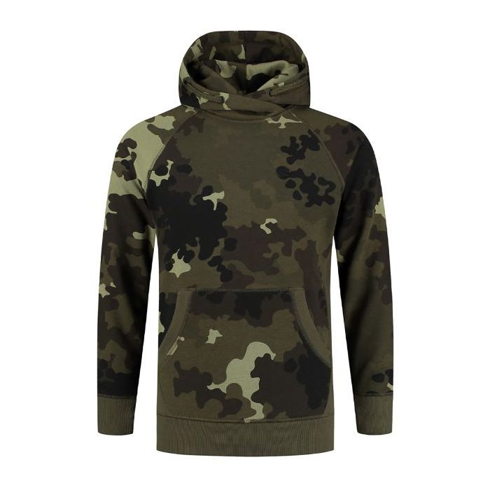 Korda TK Dark Kamo Fishing Hoodie, This is based on a classic hoodie design but has been tweaked to make it even more functional for fishing. It fits close enough to your body to provide plenty of warmth and help prevent draughts, but the raglan shoulders and stretchy underarm panels give it an action fit so that your movement isnt inhibited whilst wearing it. It is made from 320gsm fleece jersey material, so feels very cosy against your skin. The hood has a snug, crossover fit, to help keep out the cold and keep your neck warm, and it can be adjusted via two drawcord loops at the front designed so that they are easy to adjust but wont dangle down when youre photographing a fish! The sleeves have thumb holes, so that you can pull them down over the back of your hands in really cold conditions. The large kangaroo pouch pocket on. The front also features two internal upright pockets to securely store items such as your phone, car keys or sounder box. It comes in a choice of colours black, charcoal, light kamo, dark kamo, and dark olive and in sizes from small to XXXL.
