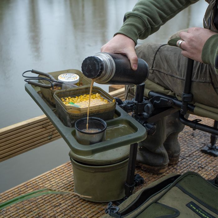 De Korum Any Chair Zijblad past direct op de Korum X25 en S23 Accessoire stoelen en transformeert stoelen in een volledig modulair visgerei station.