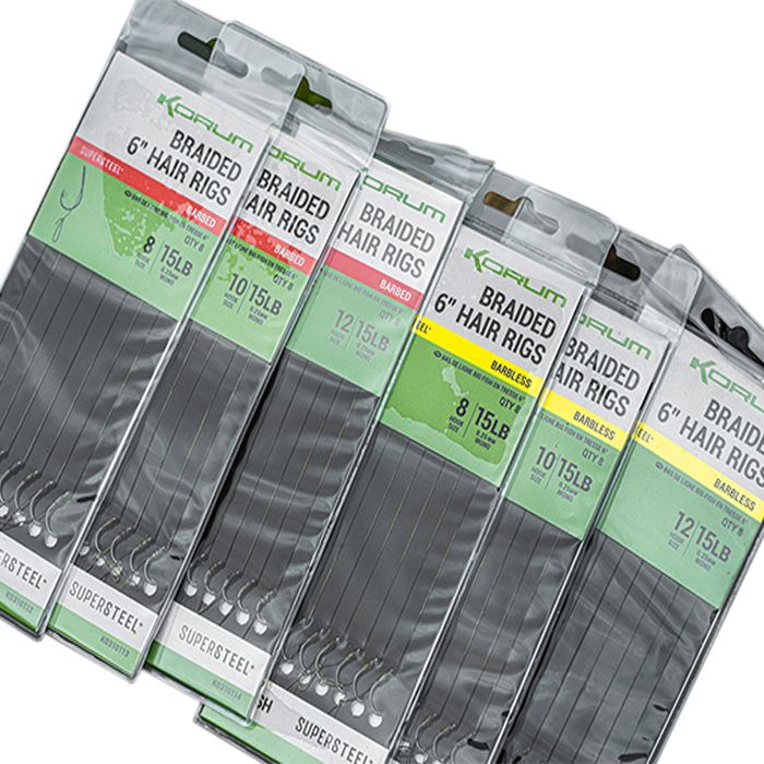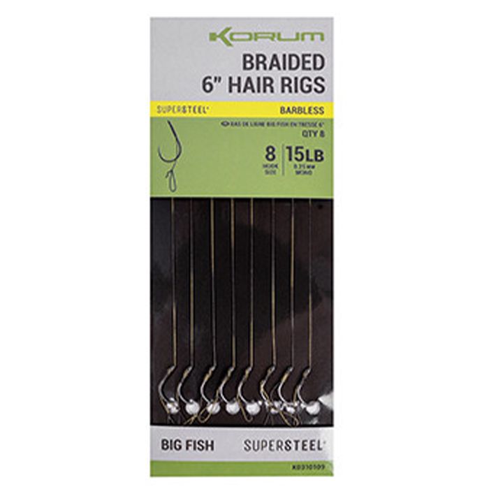 Met de Korum Big Fish Braided Hair Tuigjes kun je sterkere hair tuigjes bevestigen bij het vissen op grotere vissen. Het is 15cm lang en bestaat uit Korum Smokescreen Braid (15lb) en Korum Japanse Supersteel haken die zorgen voor de perfecte gecamoufleerde hair tuig.