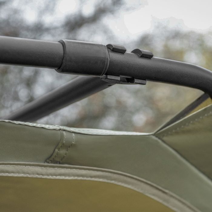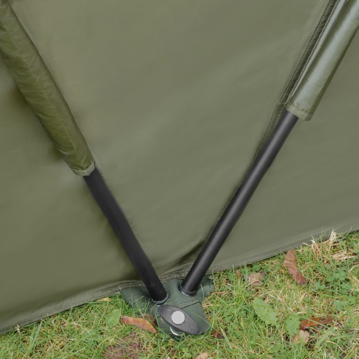 De ingebouwde spanband geeft niet alleen steun aan de structuur van de schuilplaats maar zorgt er ook voor dat de Korum Dag Schuilplaats snel en gemakkelijk kan worden opgezet. Twee telescopische palen ondersteunen de structuur van de schuilplaats. De eerste daarvan is de achterste spanstang, die zowel aan de top als aan de basis van de schuilplaats op zijn plaats klikt en kan worden verlengd voor extra spanning en structuur.