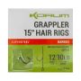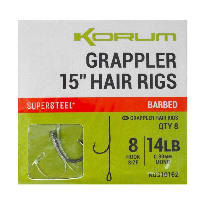 Korum Fishing Grappler Hair Rigs 15inch, Introducing the Korum Fishing Grappler Hair Rigs 15inch. Whether you're an experienced angler or a relative newcomer to the sport, these rigs will give you both the assurance and the confidence to take on those big fish. Specifically designed with larger sized fish in mind, where increased line diameters, super-strong Supersteel Grappler hooks and highly abrasion resistant Korum line make it an incredibly reliable solution. For maximum convenience when out on the water these rigs feature strong loop knots for quick rig changes while they are available in four and fifteen inch lengths with barbed and barbless options too. Whatever challenge your next fishing trip sets you having this advanced hair rigging solution from Korum firmly in your tackle box will deliver you the peace of mind that comes from consistent results every time.